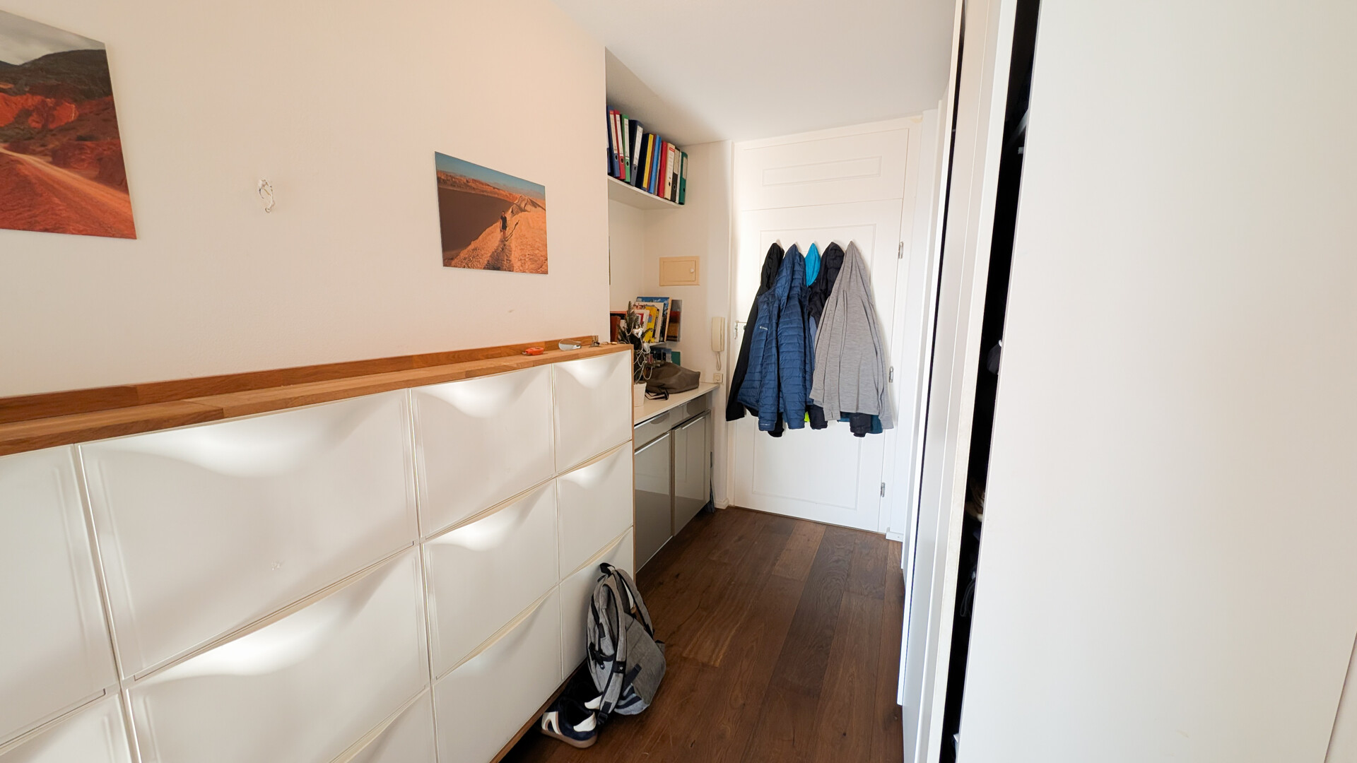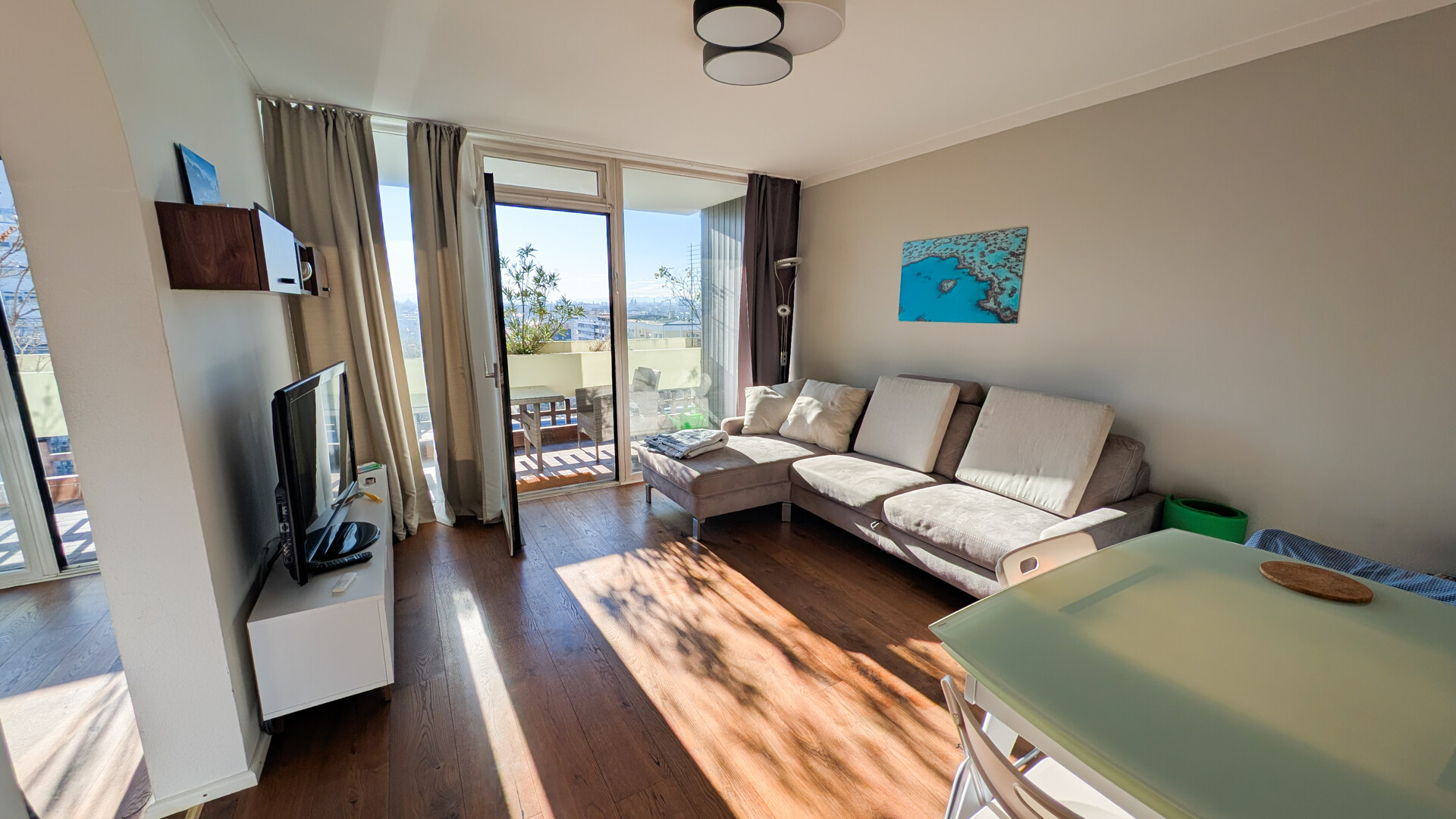 In den vergangenen Jahren wurde die Wohnung umfassend renoviert und befindet sich in sehr gutem Zustand. Der moderne Grundriss vermittelt ein großzügiges Wohngefühl. Herzstück ist der helle Wohn- und Essbereich mit bodentiefen Fenstern und direktem Zugang zum sonnigen Südbalkon mit über 12 m² Fläche und beeindruckendem Weitblick bis in die Alpen. Die offen integrierte, moderne Küche ist im Kaufpreis enthalten.