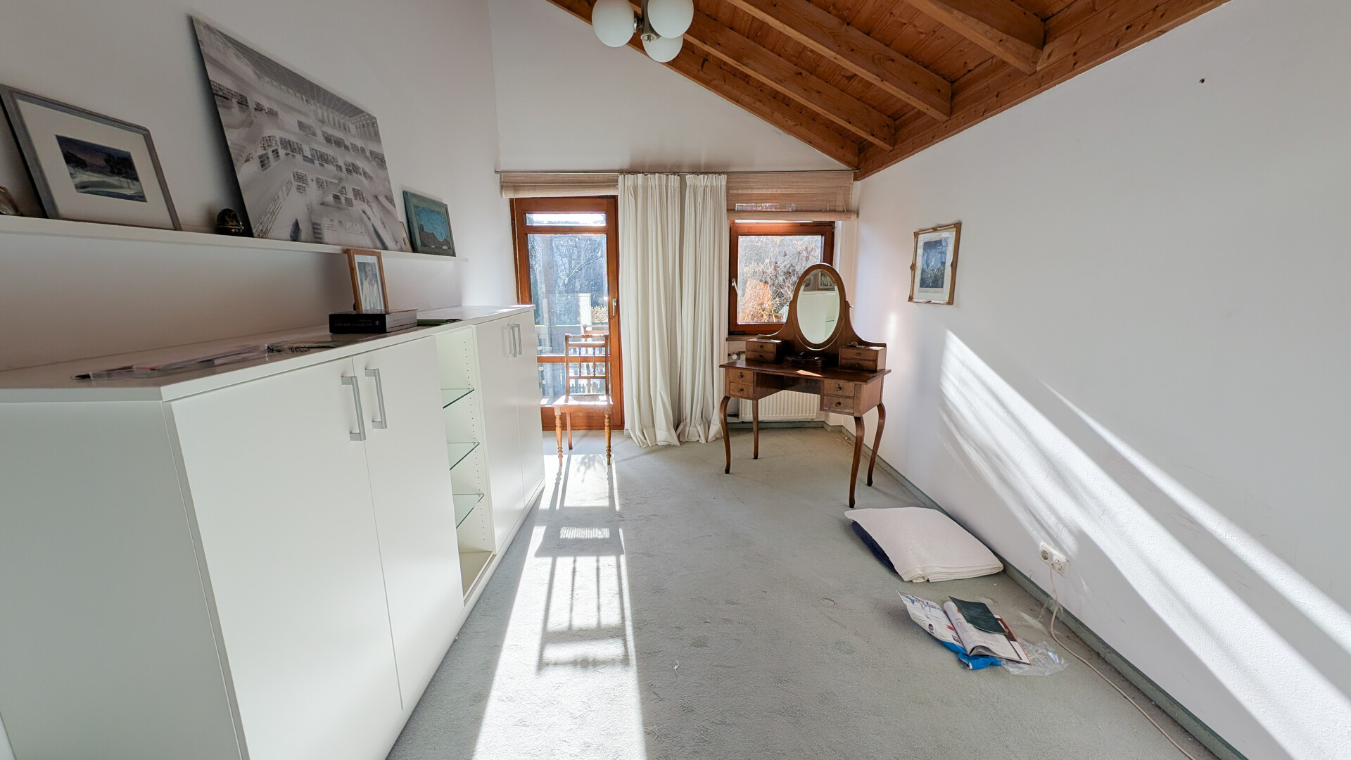 Das Obergeschoss bildet den privaten Rückzugsbereich des Hauses. Drei gut geschnittene Schlafzimmer bieten flexible Nutzungsmöglichkeiten für Eltern, Kinder oder Homeoffice. Besonders hervorzuheben sind die hohen Decken mit Sichtdachstuhl, die jedem Raum eine besondere Atmosphäre und ein großzügiges Raumgefühl verleihen. Das Badezimmer ist familiengerecht ausgestattet mit Badewanne, Dusche und Doppelwaschtisch.